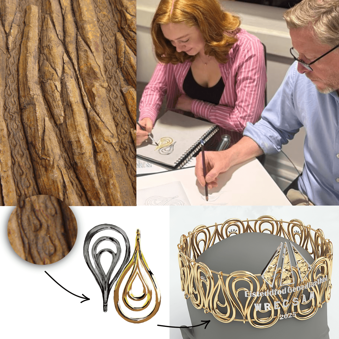 The 2025 crown is inspired by the ancient fossils discovered in Brymbo Forest—dating back over 300 million years to the Carboniferous period. During this era, layers of plant debris, combined with flooding caused by natural events, formed the rich coal seams that would one day shape the industrial legacy of Wrexham. These fossils serve as the symbolic bedrock of the crown—representing the deep-rooted foundations of the region’s identity.