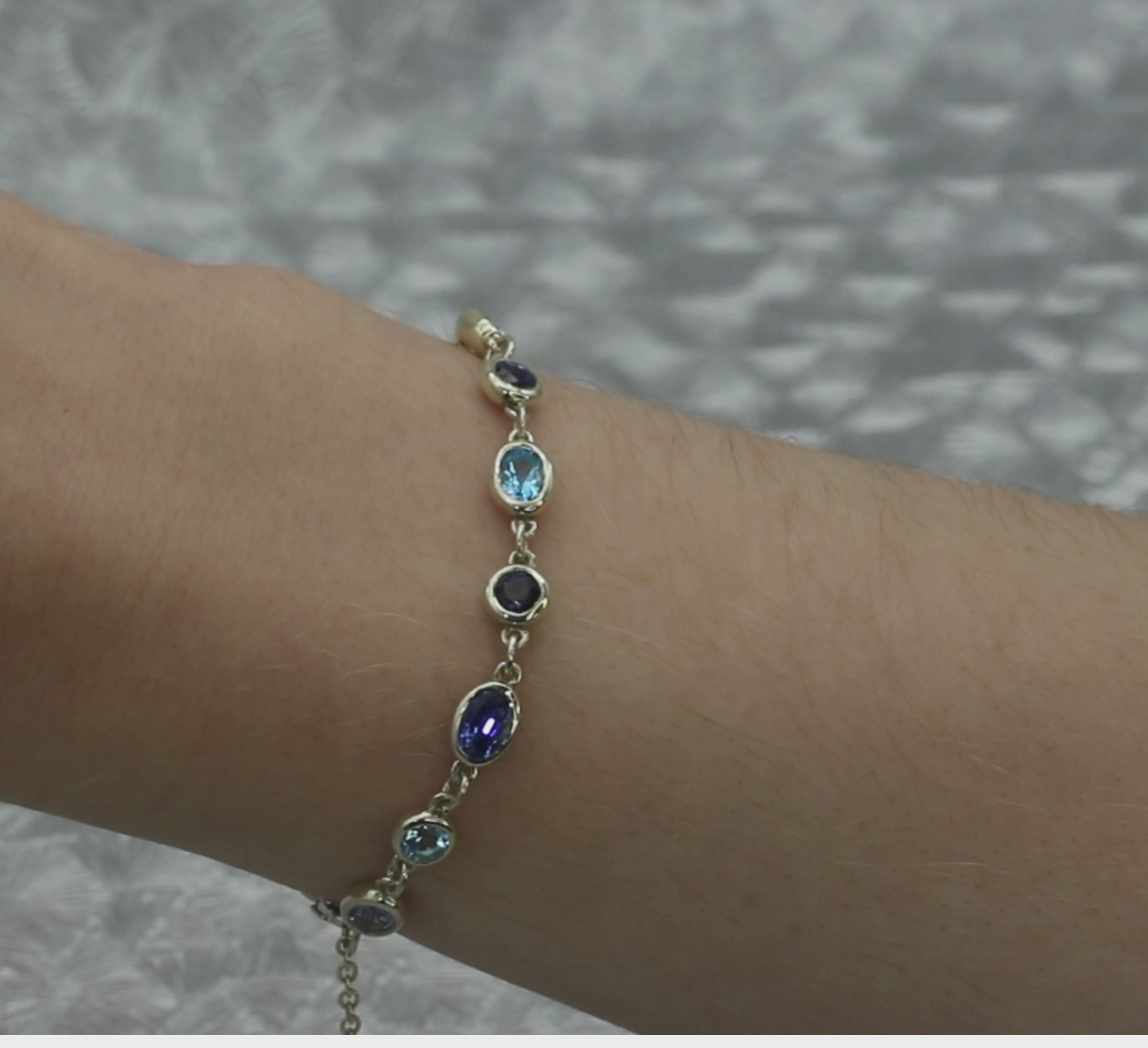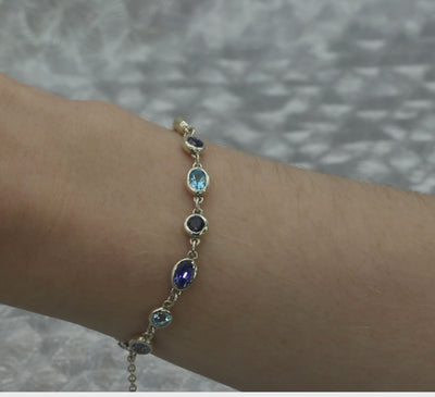 - Gemstones: 4 sapphires (varying from dark blue to light Ceylon tones), 2 topaz, 1 oval aquamarine, 1 diamond, 1 pearl (at end of bracelet)